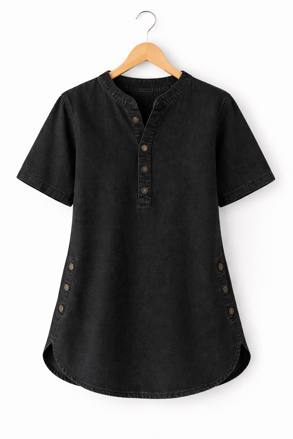 Ez a farmer tunika tökéletesen ötvözi a kényelmet és a stílust, így sokoldalú darab a mindennapokhoz. Laza, modern szabású, elöl gombos henley gallérral és rövid ujjú, ideális egy egyszerre laza és elegáns megjelenéshez. A finom mosású kivitel könnyed és trendi hangulatot kölcsönöz, míg az oldalán található gombos részletek diszkrét és egyedi bájat adnak hozzá. Könnyen kombinálható nadrággal, leggingsszel vagy akár rövidnadrággal is, így praktikus választás számos alkalomra.