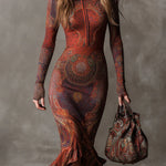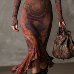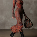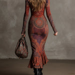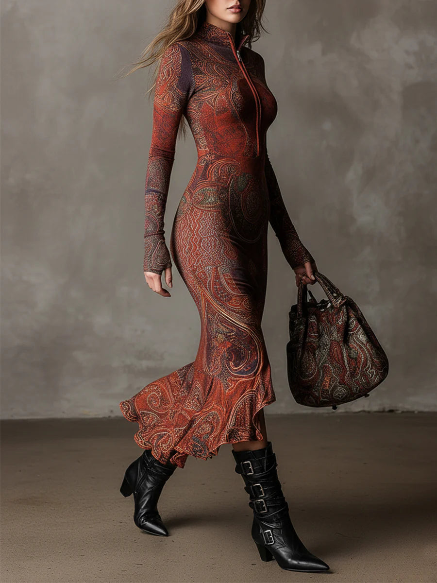 A részletgazdag mintázat és a meleg színek miatt ez a ruha azonnal kiemelkedik a tömegből – ez egy olyan darab, amely nem marad észrevétlen.