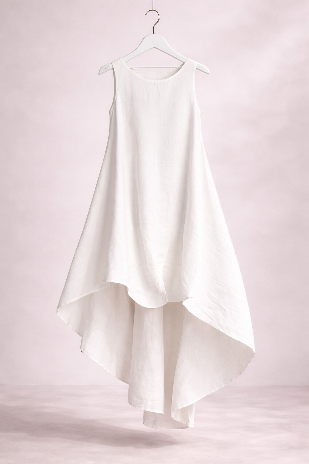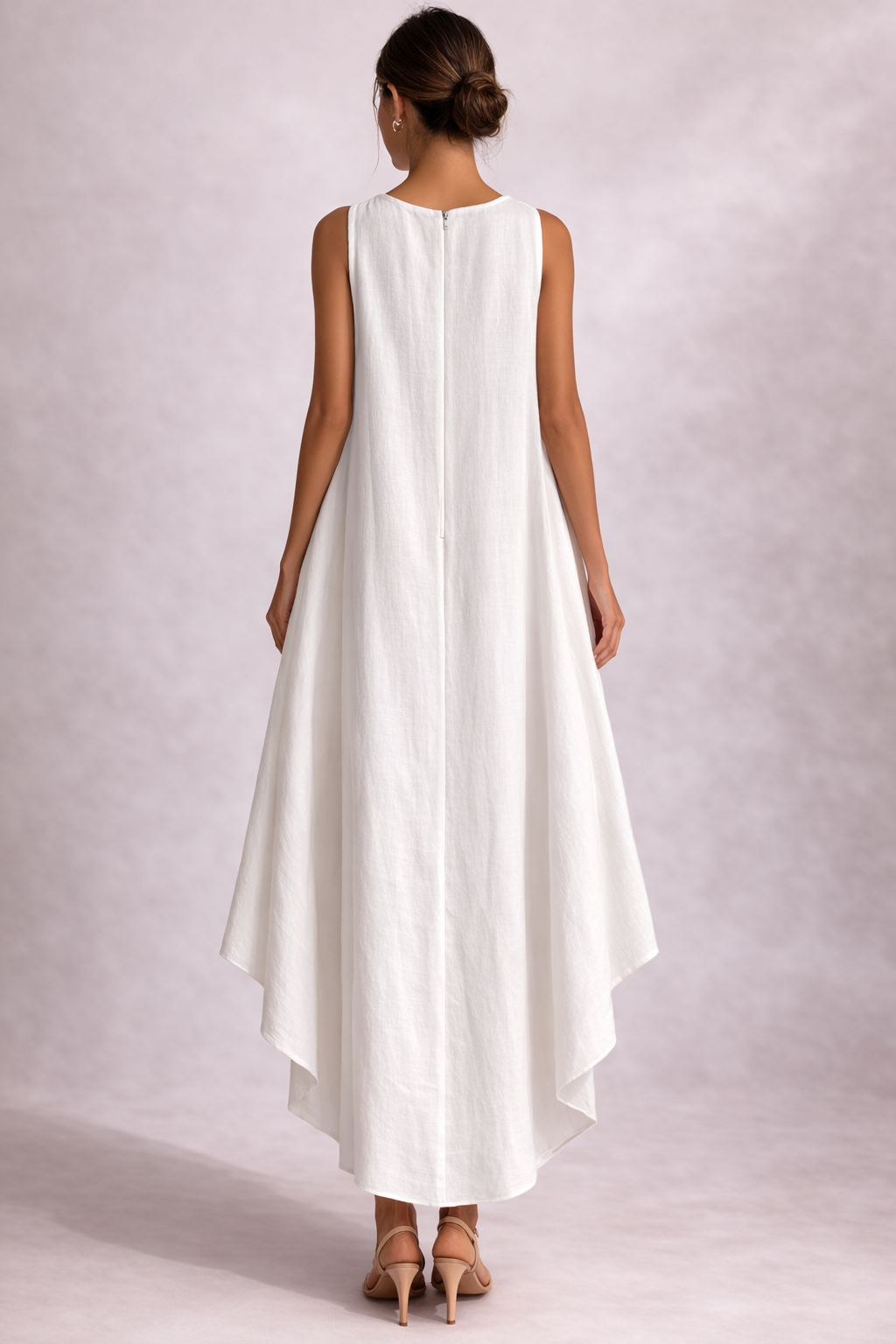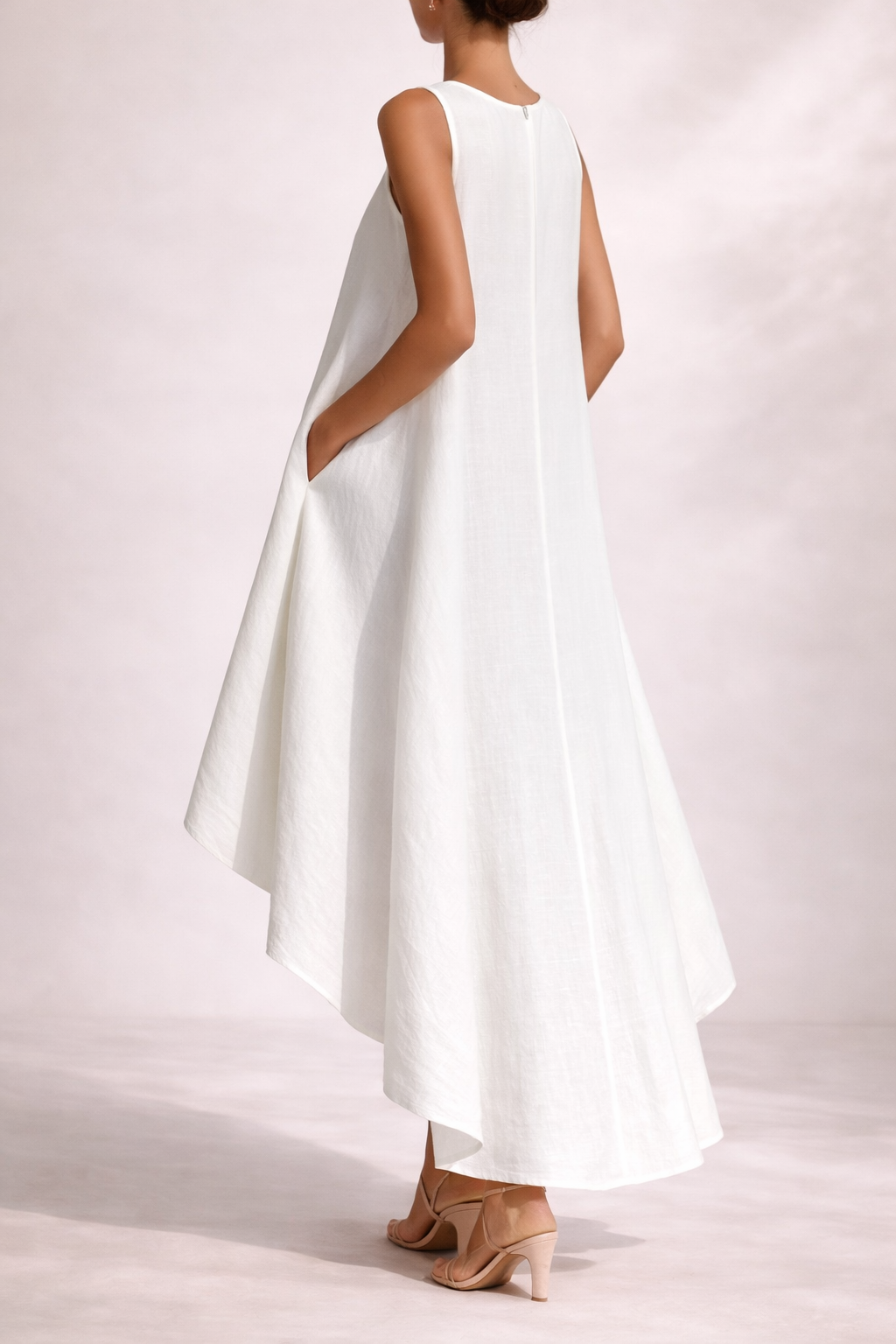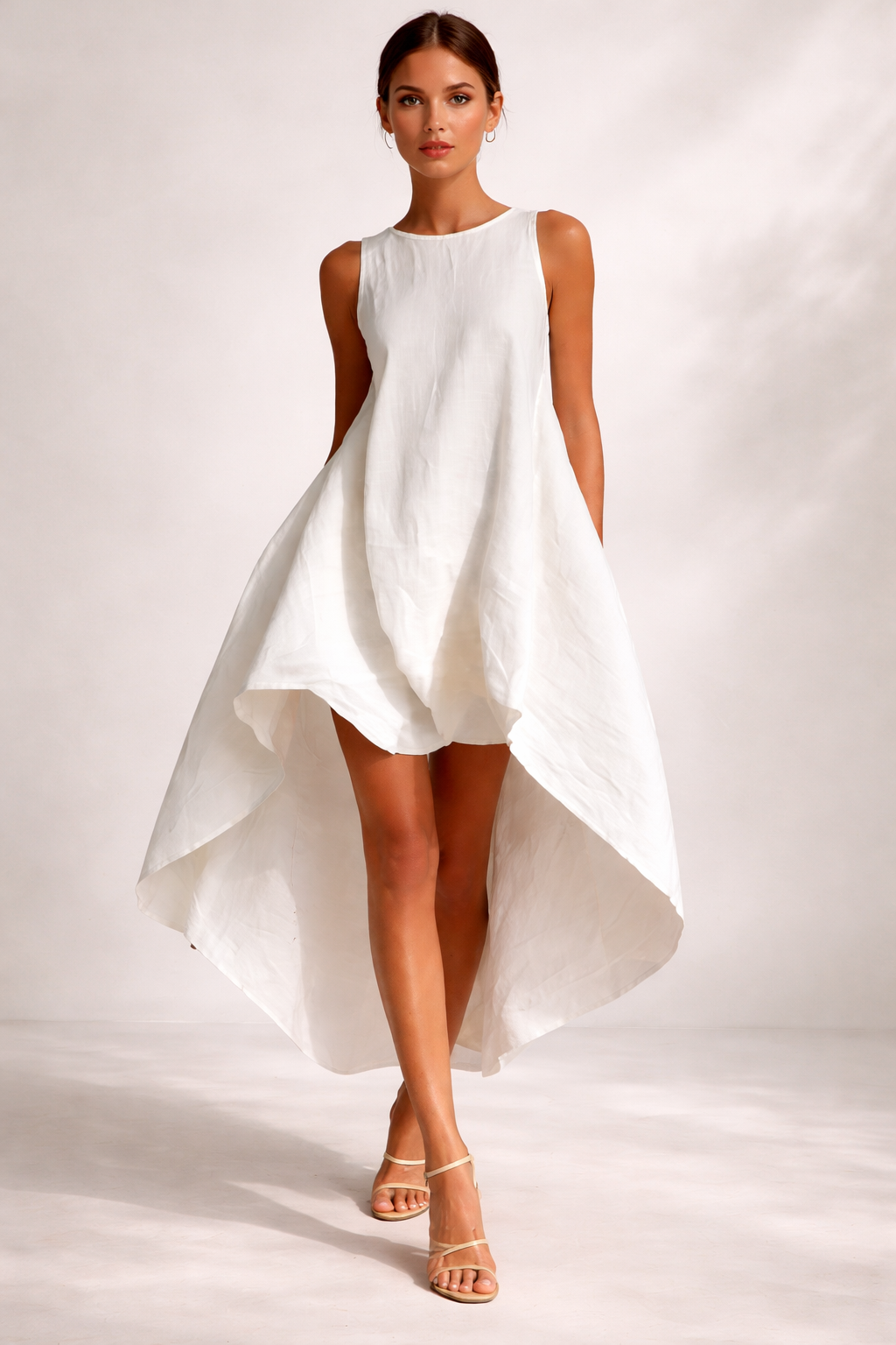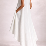 A Zsófia Szellő Midi Ruha minimalizmust és kifinomultságot ötvöz egy könnyed, lebegő szabású ruhában, amely minden lépésnél elegánsan mozog. Aszimmetrikus szabásával, amely dinamikus és modern vizuális hatást kelt, ez a darab könnyedségével és laza szabásával tűnik ki, amely minden testalkatot előnyösen mutat. A tiszta fehér szín frissességet és kifinomultságot sugároz, míg a ujjatlan kialakítás és a finom kivitel tökéletessé teszi nyári napokra, különleges eseményekre vagy olyan alkalmakra, ahol a kevesebb több – de maximális hatást kelt.