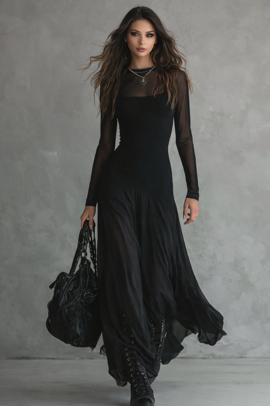 A Rubia – Elegáns maxi ruha fekete tüllből a modern elegancia tökéletes megtestesítője, egy merész csavarral. A modell szűk felső része kiemeli az alakot, míg a könnyű tüllből készült, lebegő maxi szoknya minden lépésnél mozgást és kifinomultságot kölcsönöz. Az átlátszó ujjak finom és kortárs részletet adnak, míg a monokróm fekete stílus teszi ezt a darabot sokoldalúvá és ellenállhatatlanul elegánssá. Ideális különleges eseményekre, vacsorákra, partikra vagy olyan alkalmakra, amikor magabiztosan és stílusosan szeretne kiemelkedni.
