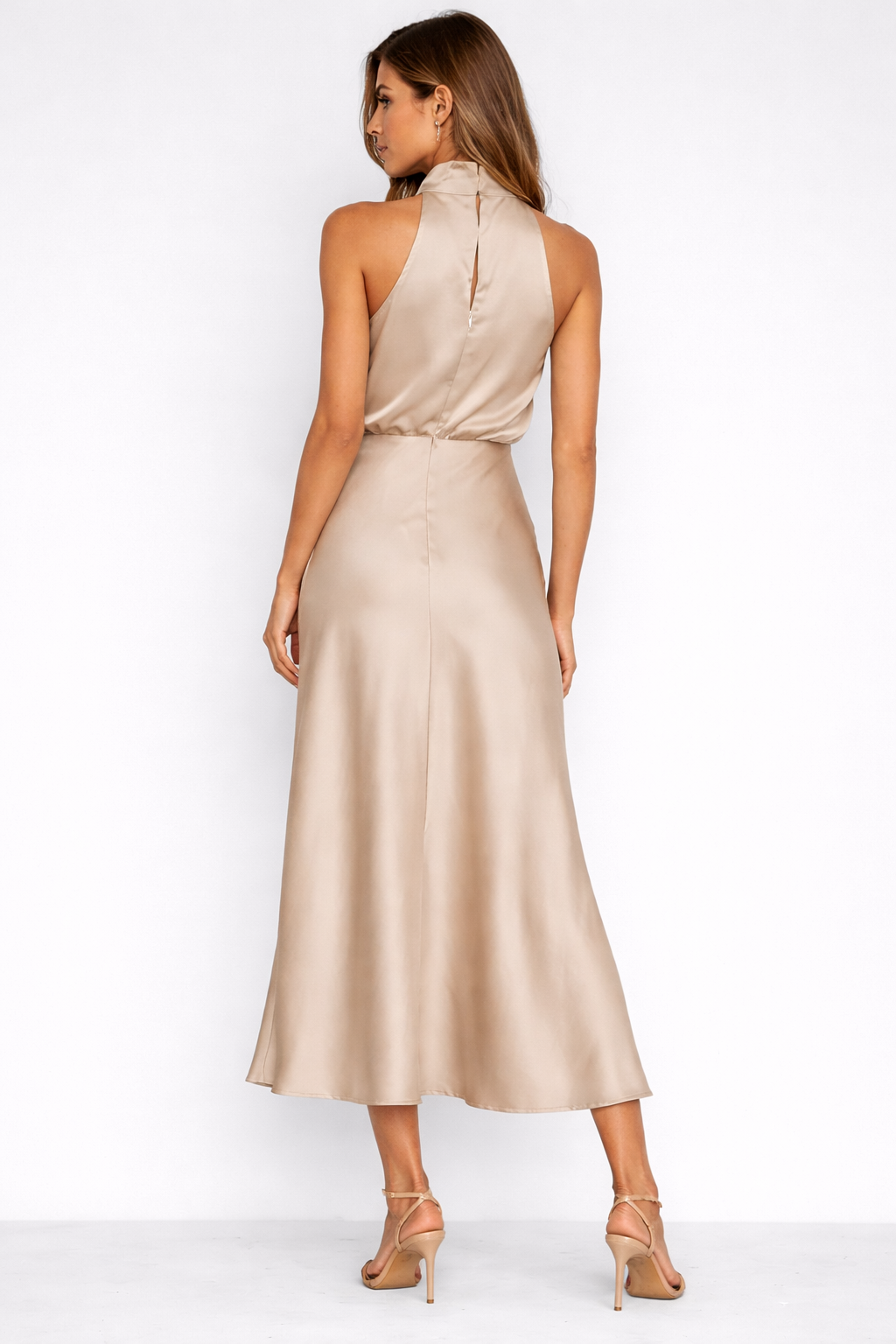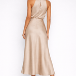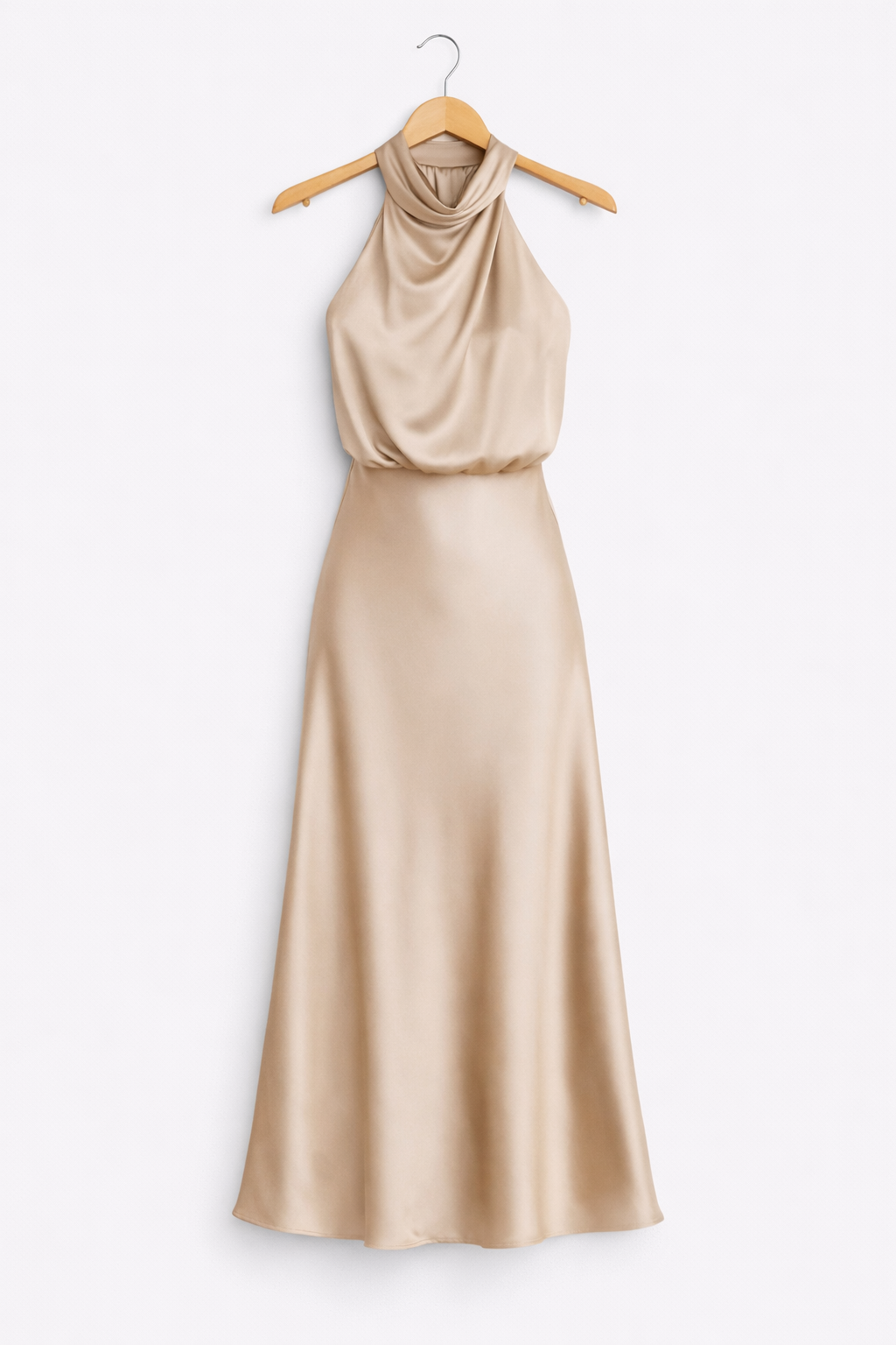 Ez az elegáns, nyakpántos ruha kifinomult és nőies kialakításával tűnik ki, ideális különleges alkalmakra vagy olyan eseményekre, ahol a stílus és az elegancia elengedhetetlen. A puha, lebegő anyag tökéletesen illeszkedik a testhez, kiemelve az alakot, míg a drappált nyakkivágás modern és kifinomult megjelenést kölcsönöz a ruhának. A hosszú, enyhén tüllös szoknya természetes mozgást kölcsönöz járás közben, így ez a darab kényelmes és egyben rendkívül elegáns is. Könnyen kombinálható magas sarkú szandállal vagy finom kiegészítőkkel, ez a ruha sokoldalú választás azok számára, akik kifinomult és időtálló megjelenést keresnek.