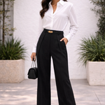 Az Elara Luxe nadrág ötvözi a kifinomultságot egy modern és elegáns hangulattal. Széles szárú, magas derékvonalú szabásával harmonikusan kiemeli az alakot, és kényelmes, lebegő esést biztosít. Sokoldalú és időtálló, könnyen alkalmazkodik különböző alkalmakhoz – a formális megjelenéstől a lazább kombinációkig –, így elengedhetetlen darabja lesz a kifinomult ruhatárnak.