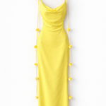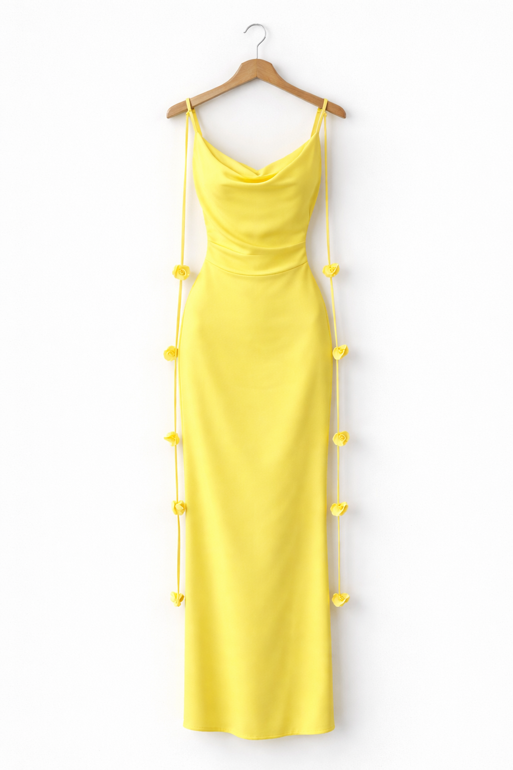 Ez a ruha könnyed és nőies eleganciájával tűnik ki, tökéletes választás nyári napokra vagy szabadtéri különleges alkalmakra. A sziluettet megnyújtó, lebegő szabású ruha és a lágy, cowl-stílusú nyakkivágás ötvözi a kényelmet a kifinomultsággal. A pántokon végigfutó apró virágok finom díszítései romantikus és egyedi hangulatot kölcsönöznek a ruhának, így ez a darab minden pillanatban frissességet, ragyogást és bájt sugároz.